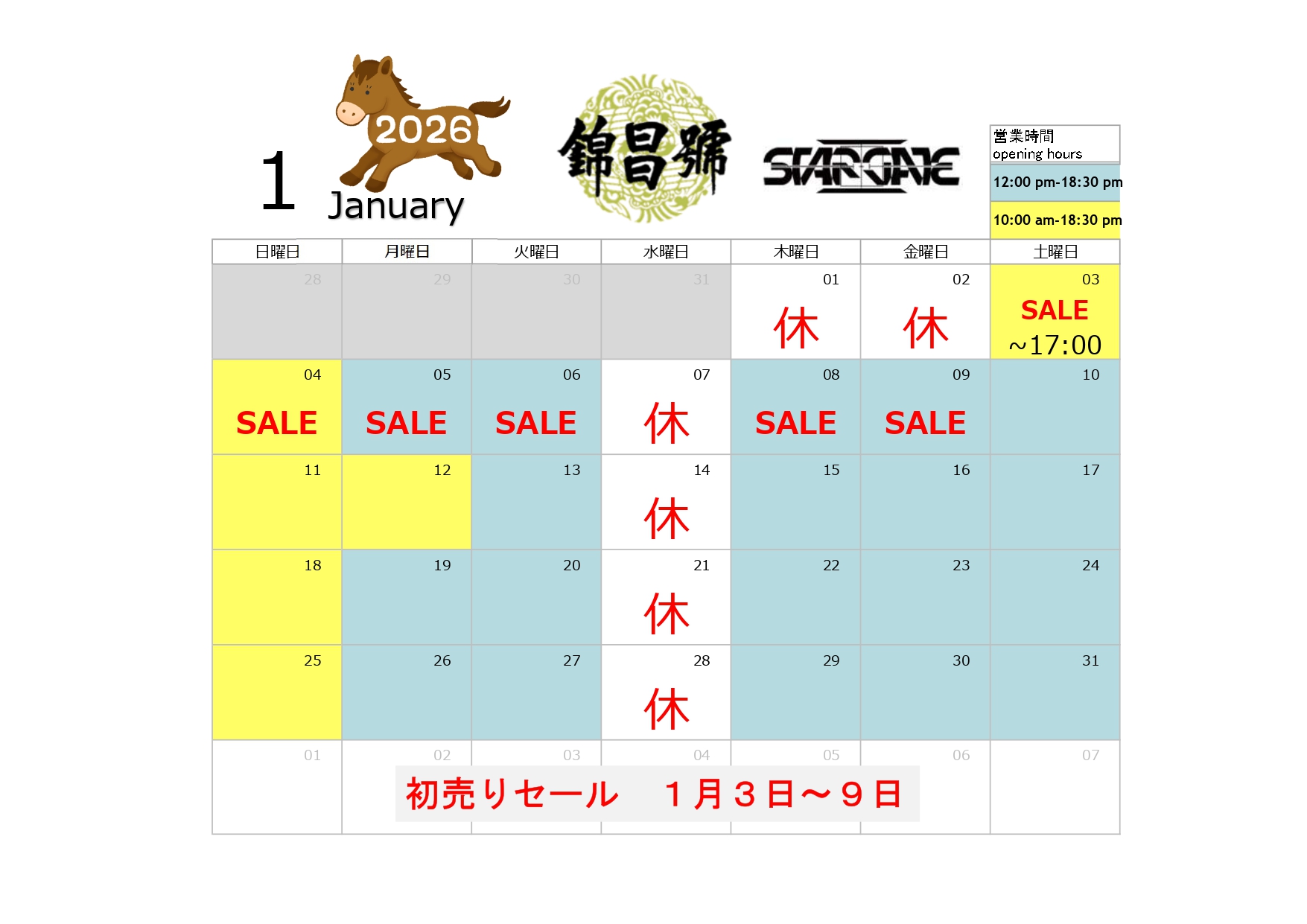 初売りセール 1月3日~9日